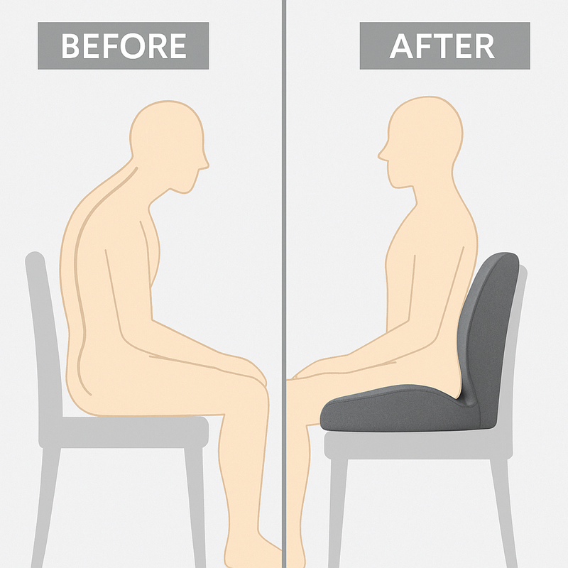 Our cushion was designed with a universal L-shape to fit almost all seats β office chairs, dining chairs, car seats, and wheelchairs. As long as the seat is standard size, the cushion will sit securely and provide full back + hip support.